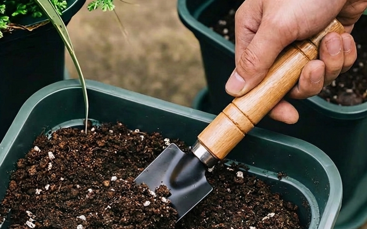 Move compost neatly around stems without mess. The narrow trowels help protect delicate roots.