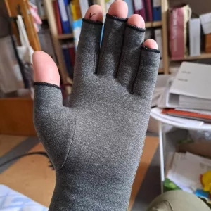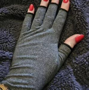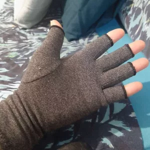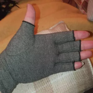 These gloves are amazing! Wearing them, my hands feel much better. The compression is comfy, and the fingerless style lets me type and write easily. They truly help reduce my swelling and stiffness, providing relief all day long. Plus, they are so light, I hardly notice them. Highly recommend!