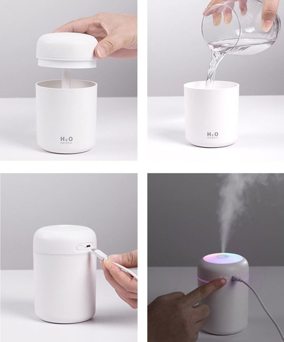Setting up this air purifier is easy. Fill the 300ml water tank, connect the USB plug to a power outlet and turn on with a simple On/Off power button. You also have the option to change mist settings and turn on the color-changing ambient or night light with a long press. A super simple, convenient, and effective solution for moisturizing air at home or in your workspace.