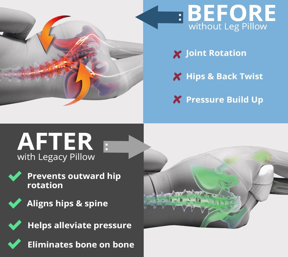 - Side sleepers — Side-sleeping can put pressure on your spine, hips, and sciatic. The contour pillow cushions your knees and cradles your legs, relieving stress on joints while restoring your lower back alignment to help alleviate back, hip, leg, knee and sciatic nerve discomfort.