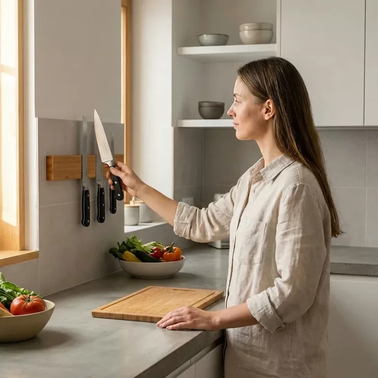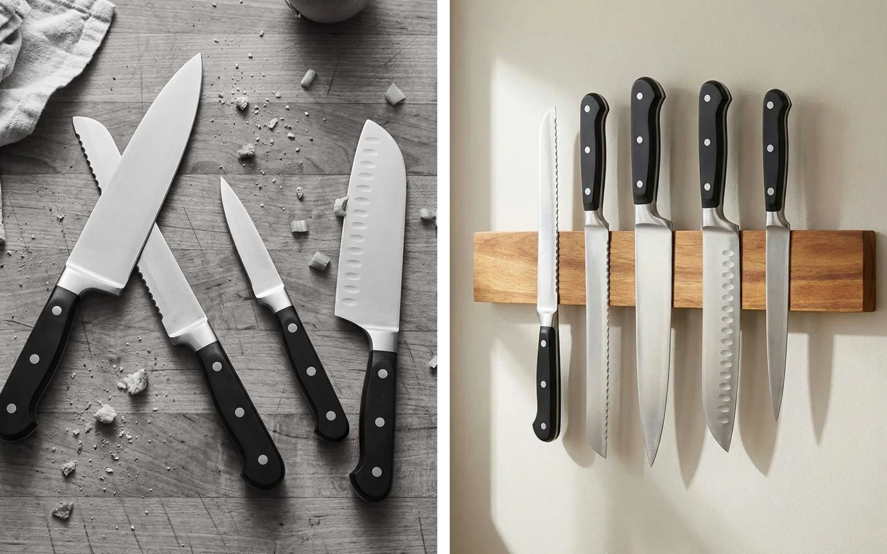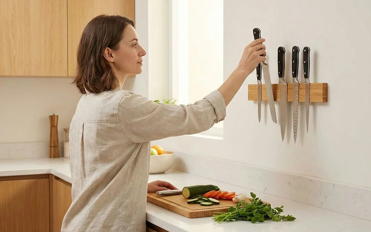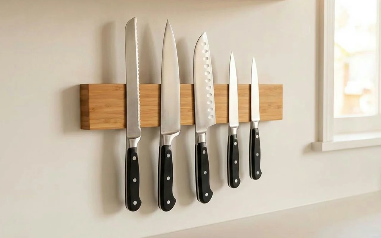 We have almost no bench space, so this magnetic holder changed everything. Pans, bowls, and cutting boards fit better now that the knives live on the wall.