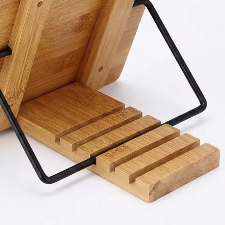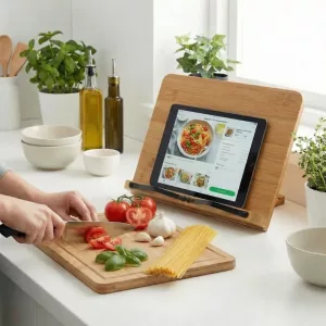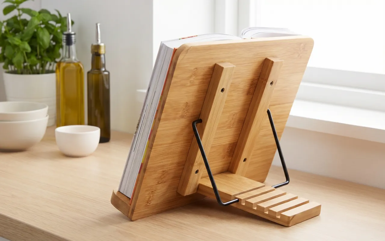 Nygex cookbook stand holds pages steady during busy kitchen moments. Hands stay free for chopping, stirring, and safe hot-pan handling. A strong bamboo frame supports tablets, manuals, and heavy hardback volumes. Foldable construction slips easily into drawers, bags or crowded cupboards.