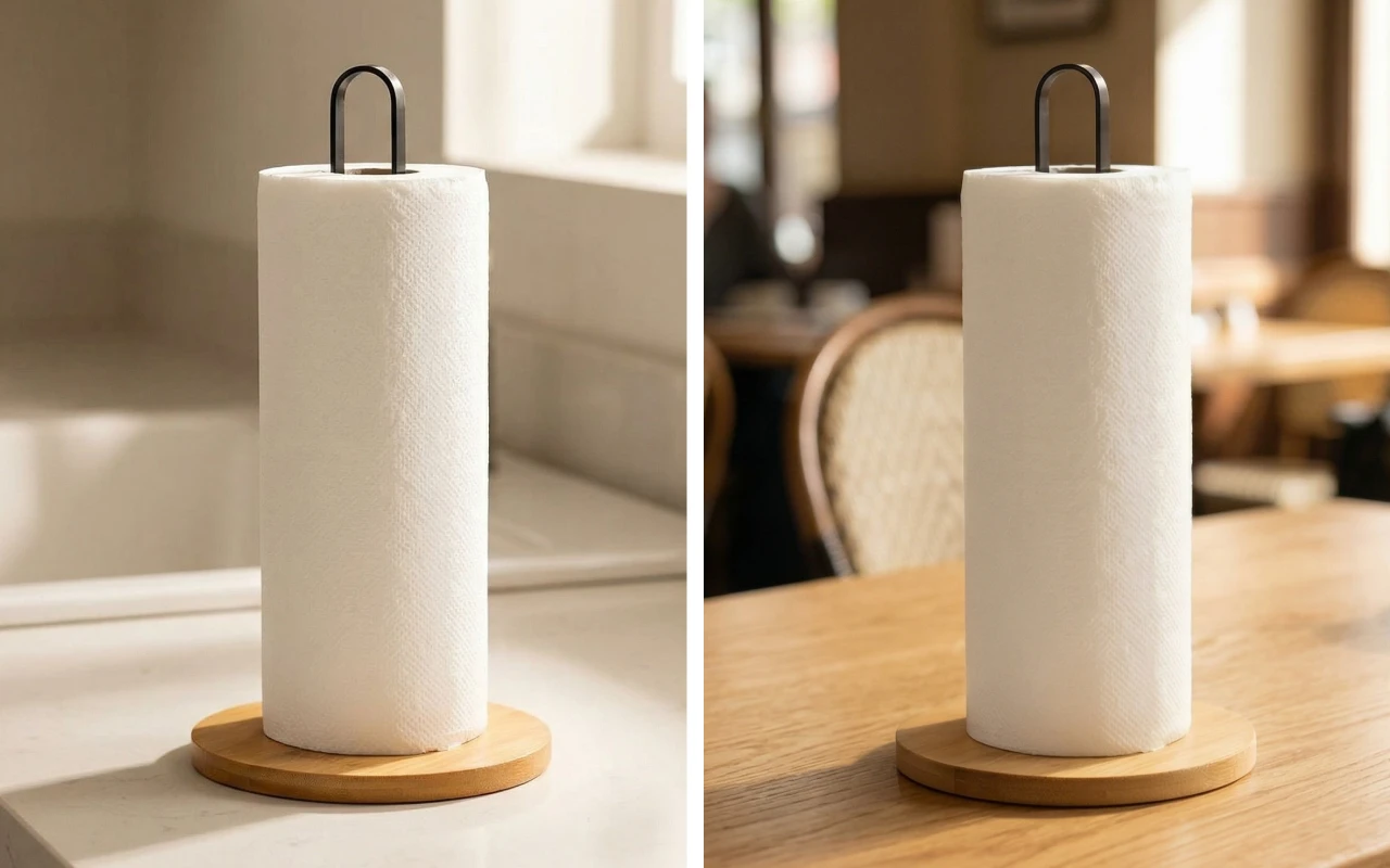 I use this holder on our balcony table during barbecues. Wind doesn’t knock it over, the roll stays in place, and the dark frame looks great outdoors.